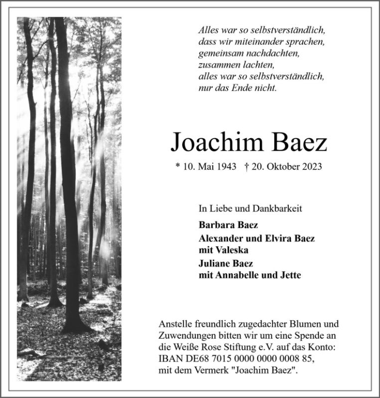 im Namen der Weiße Rose Stiftung und auch persönlich übermittle ich Ihnen und Ihrer Familie unsere große Anteilnahme am Tod von Joachim Baez. Für uns war Herr Baez ein hoch geschätztes Beiratsmitglied. Im Beirat wie auch im Trägerverein unserer Organisation erlebten wir ihn als engagiert im Gedenken, immer ausgleichend in Diskussionen und im persönlichen Umgang stets freundlich und wohlwollend.